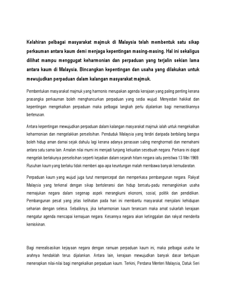 Telugu Vikzzzz Pengenalan Perpaduan Kaum Merupakan Satu Proses Yang Studocu from d20ohkaloyme4g.cloudfront.net Faktor pembentukan masyarakat majmuk di malaysia.faktor kewujudan masyarakat majmuk di malaysia dan kesannya dalam sistem sosial ras kumpulan etnik budaya bahasa kepercayaan agama ideologi ciri ciri masyarakat majmuk keunikan masyarakat majmuk di malaysia dicirikan dari segi. Memperjuangkan demokrasi, kebebasan, hak asasi manusia dan hak kelangsungan hidup atau survival. Oleh itu wujud masyarakat berbilang kaum ras etnik dan bangsa di malaysia. Pembentukan masyarakat majmuk yang berbilang kaum di malaysia pada abad ke 19 adalah kesan daripada kolonialisme yang mutlak. Setelah kemasukan migran daripada luar, bermulalah proses pembentukan masyarakat majmuk yang berbilang kaum seperti sekarang. Ekonomi tanah melayu ketika zaman kolonial bersifat majmuk. Kedatangan agama islam ke melaka dibawa melalui jalan laut oleh pedagang. Malaysia merupakan salah satu negara berbilang kaum yang dapat hidup dengan harmoni.